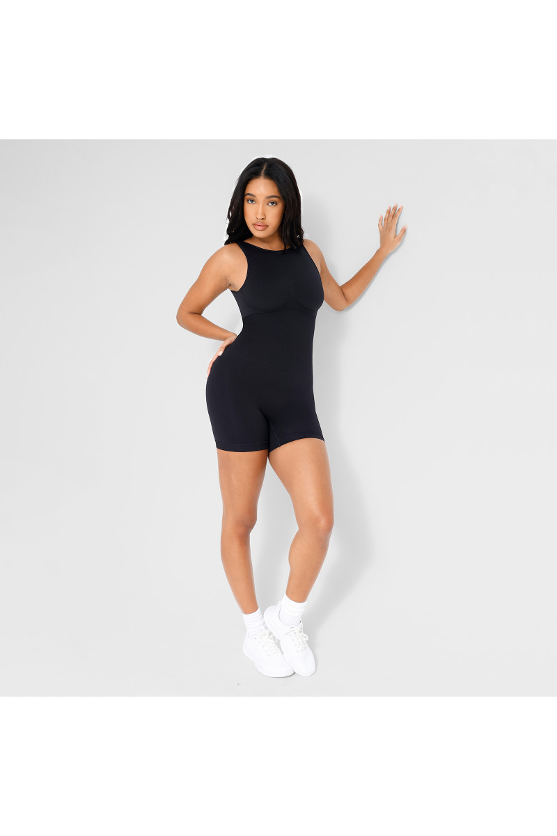 С уникальным круглым вырезом и открытой спиной, комбинезон акцентирует внимание на естественной линии вашего тела. Специальная утяжка живота поможет вам добиться стройного силуэта, а встроенная поддержка груди обеспечит комфорт и отличный внешний вид.