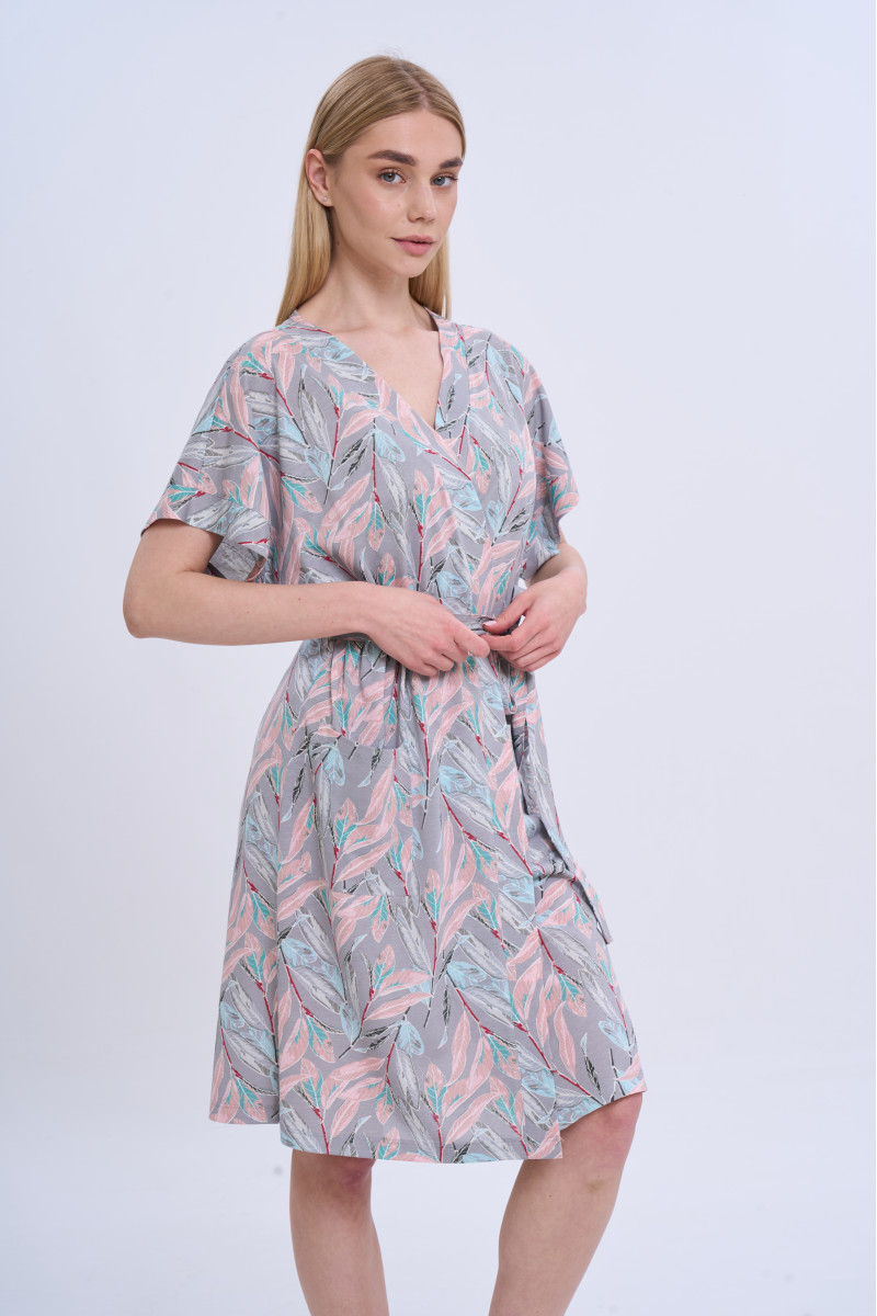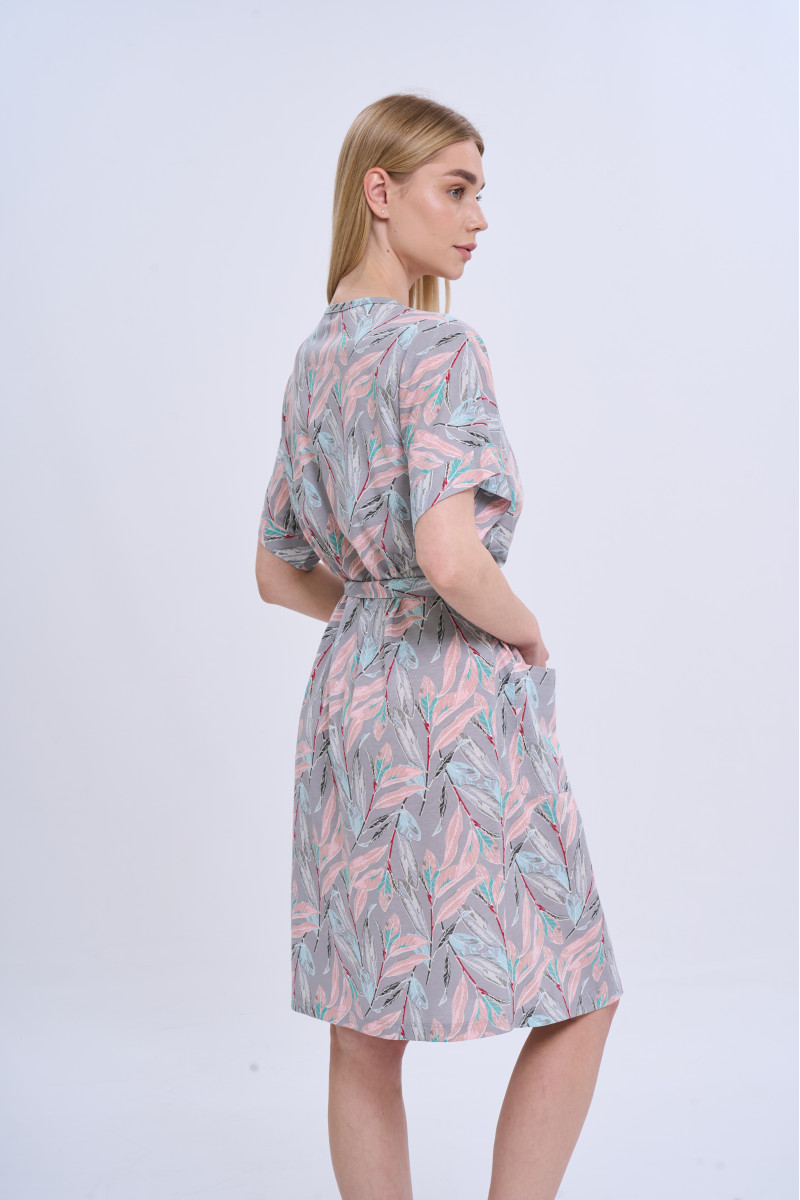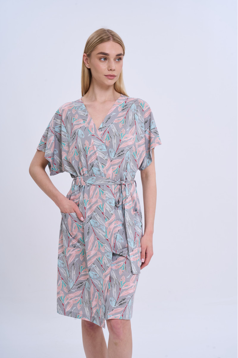 Халат имеет классический крой «на запах», который легко регулируется с помощью пояса, подчеркивая силуэт и обеспечивая комфортную посадку. Рукав длиной до локтя с легким скошенным кроем придает изделию современности и непринужденность, а также делает его практичным для ежедневного использования. Наличие удобных карманов повышает функциональность модели, позволяя всегда иметь под рукой необходимые мелочи.