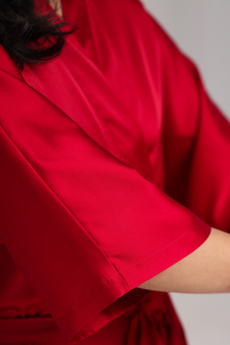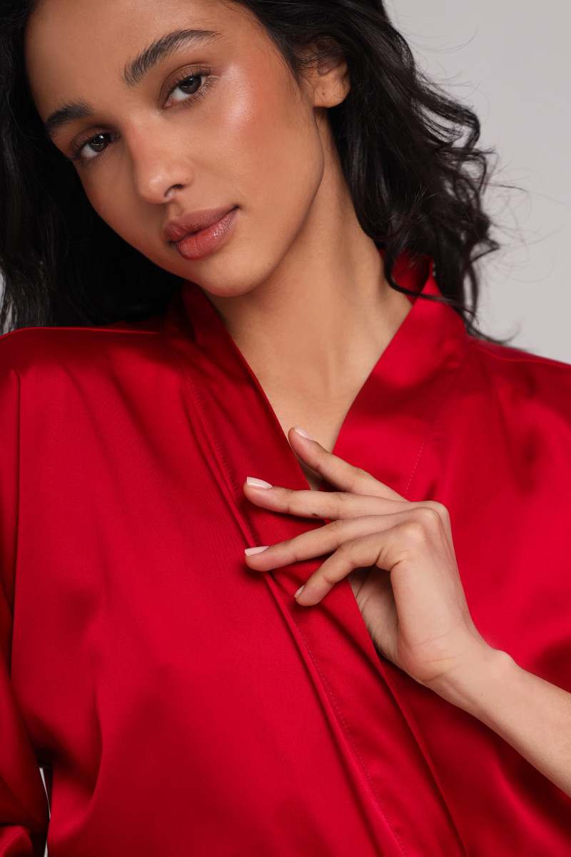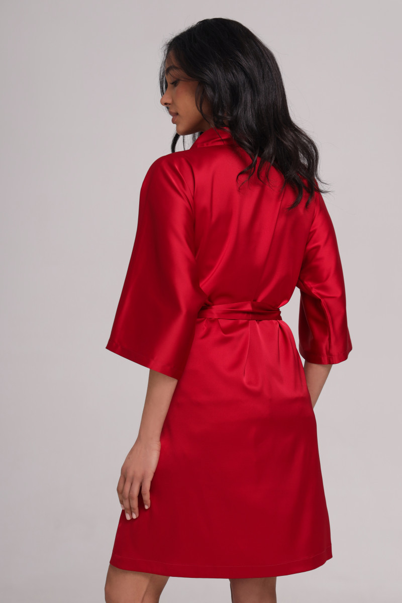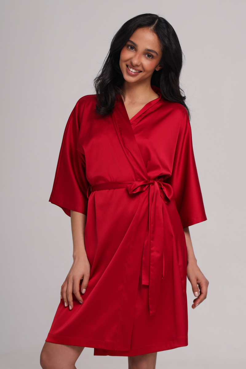 Модель виконана з високоякісного шовку, який дарує відчуття легкості, дозволяючи вашій шкірі дихати та почуваючи себе неймовірно комфортно. Халат має стильну конструкцію на запах із поясом, що підкреслює фігуру та дозволяє регулювати посадку за вашим бажанням. Рукави до ліктя забезпечують свободу рухів, а довжина до середньої частини стегна робить виріб універсальним для різних випадків - від ранкових ритуалів до розслаблюючих вечірніх моментів.