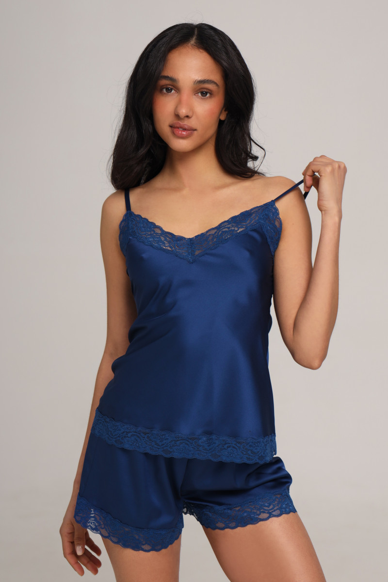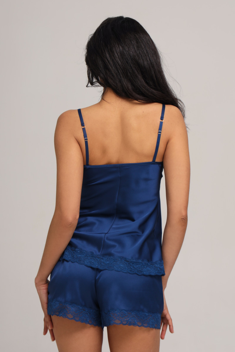 Комплект шовковий жіночий топ та шорти з мереживом, синій