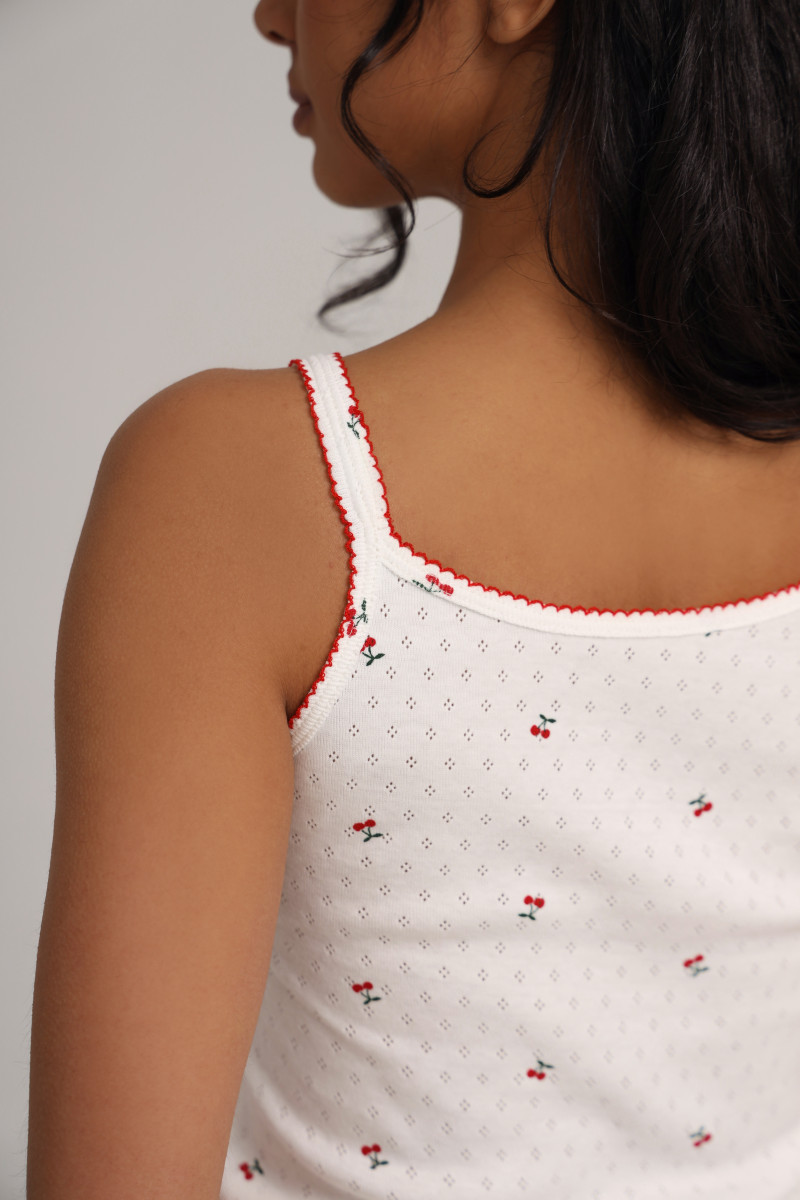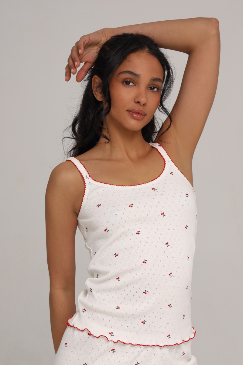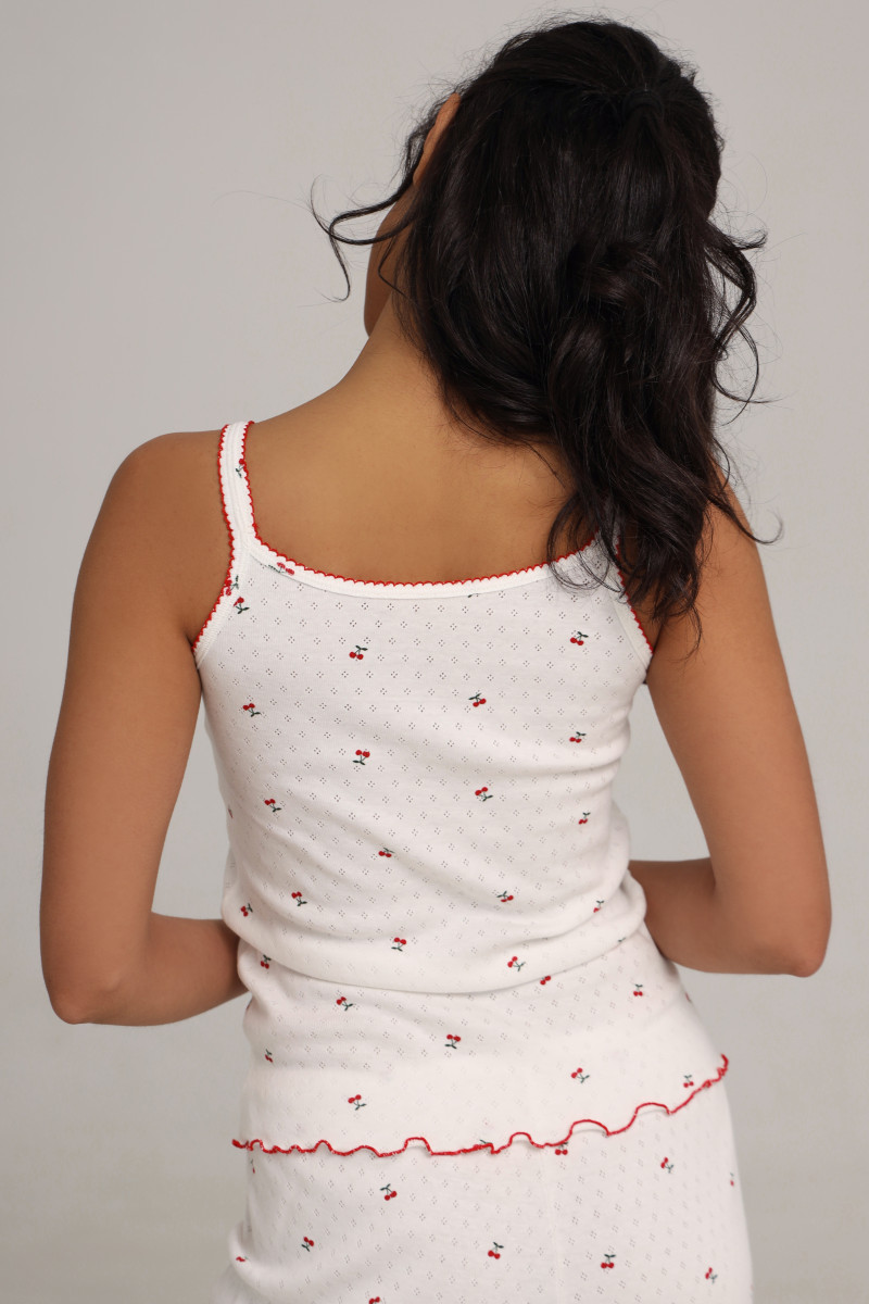 Легкий ажурный трикотаж с нежным принтом вишни на ткани придает изделию свежий и игривый вид, а красный кант по краям добавляет легкий акцент, который придает особый шарм.