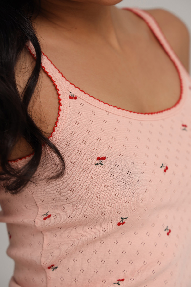 Легкий ажурный трикотаж с нежным принтом вишни на ткани придает изделию свежий и игривый вид, а красный кант по краям добавляет легкий акцент, который придает особый шарм.