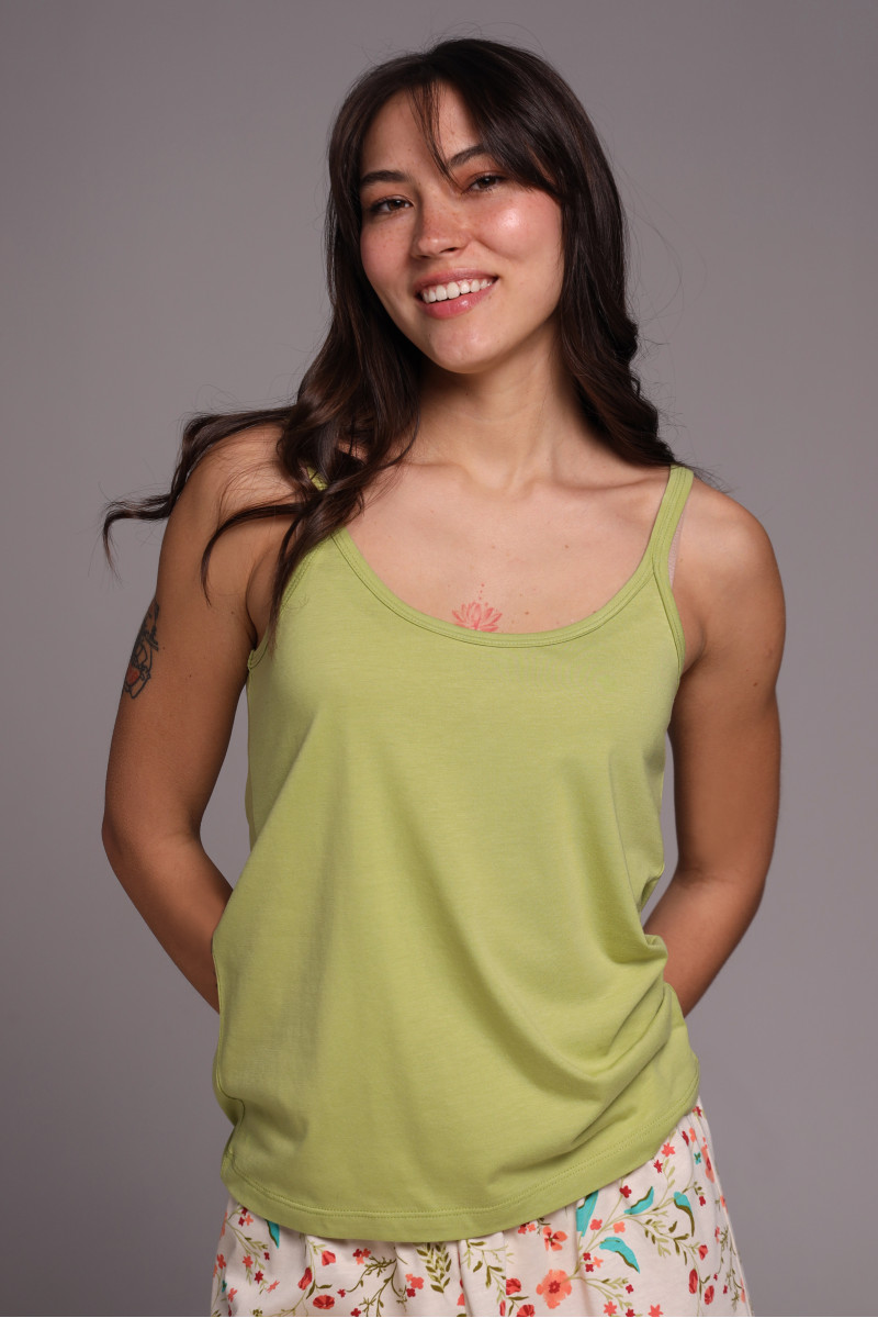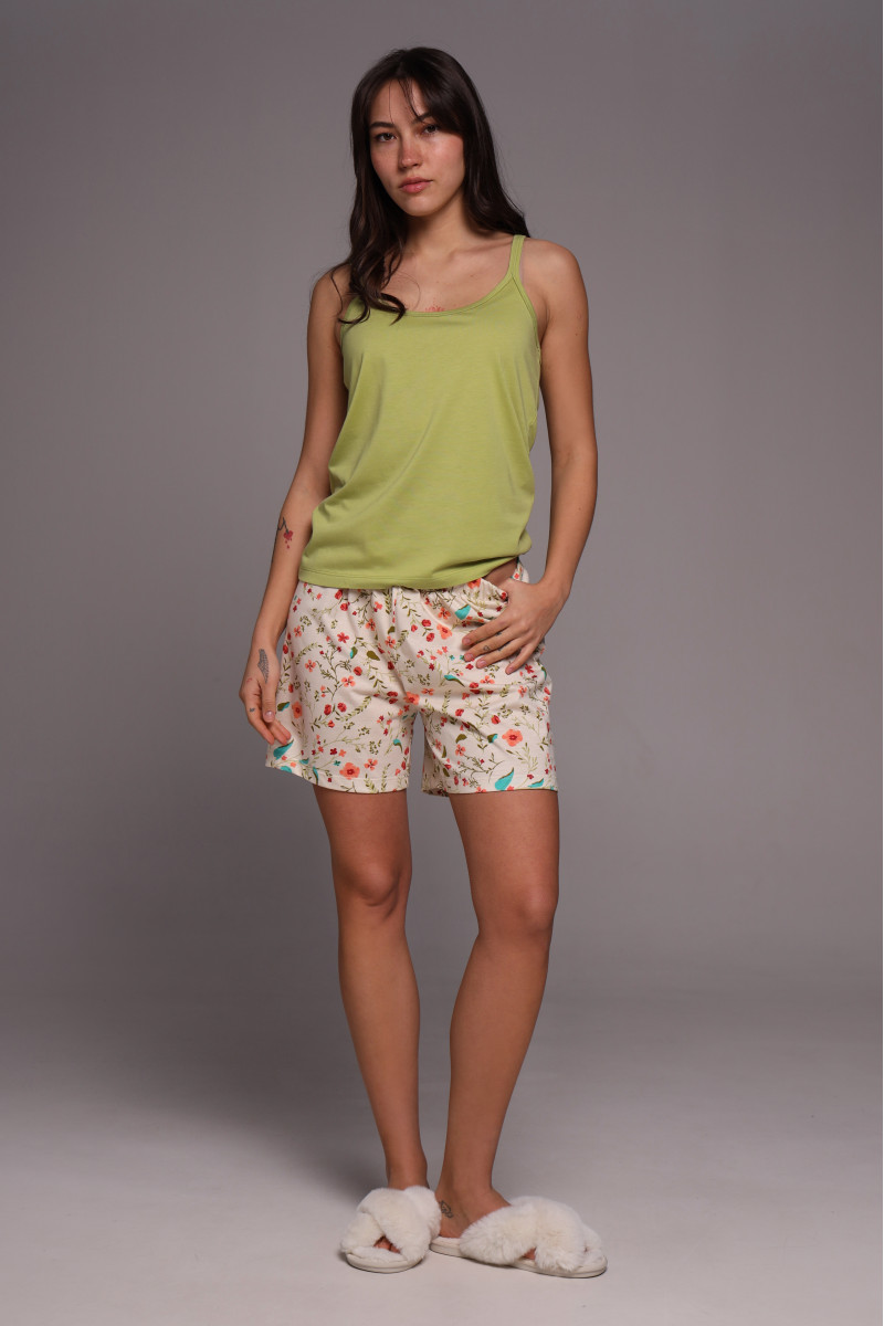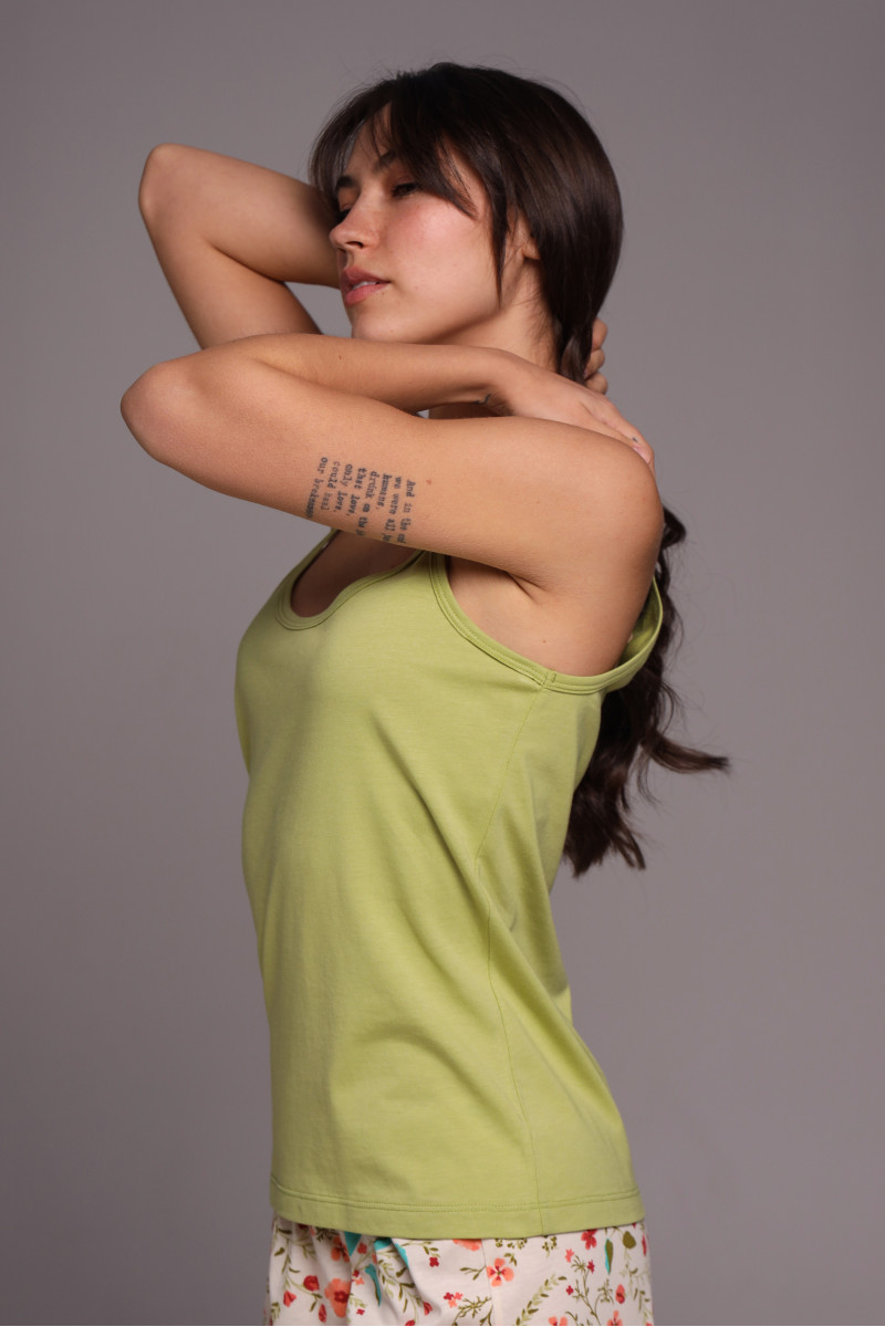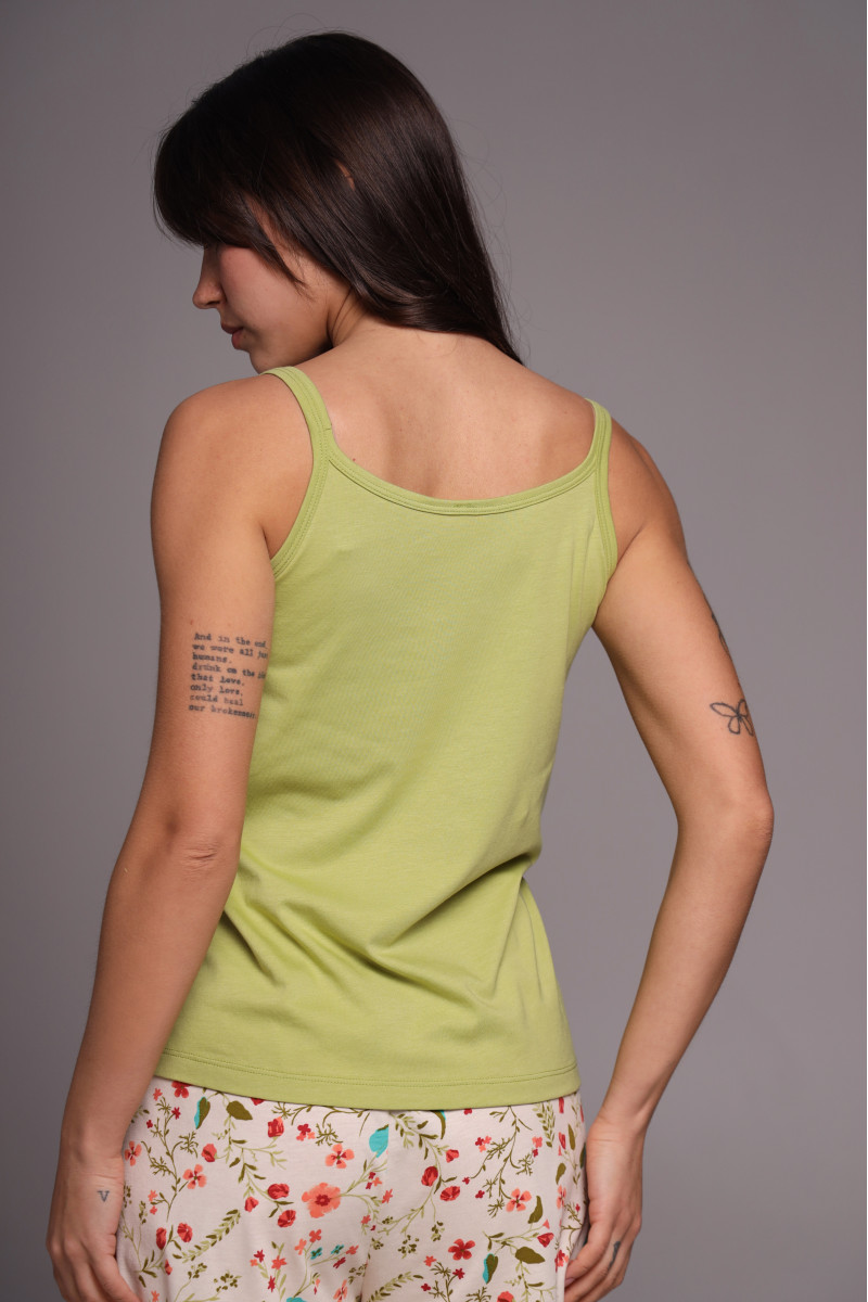 Зеленый оттенок майки напоминает свежесть природы, а тонкие бретели придают модели элегантности и изящества, подчёркивая женственные линии плеч. Свободный крой не сковывает движений и дарит абсолютный комфорт во время сна или отдыха.