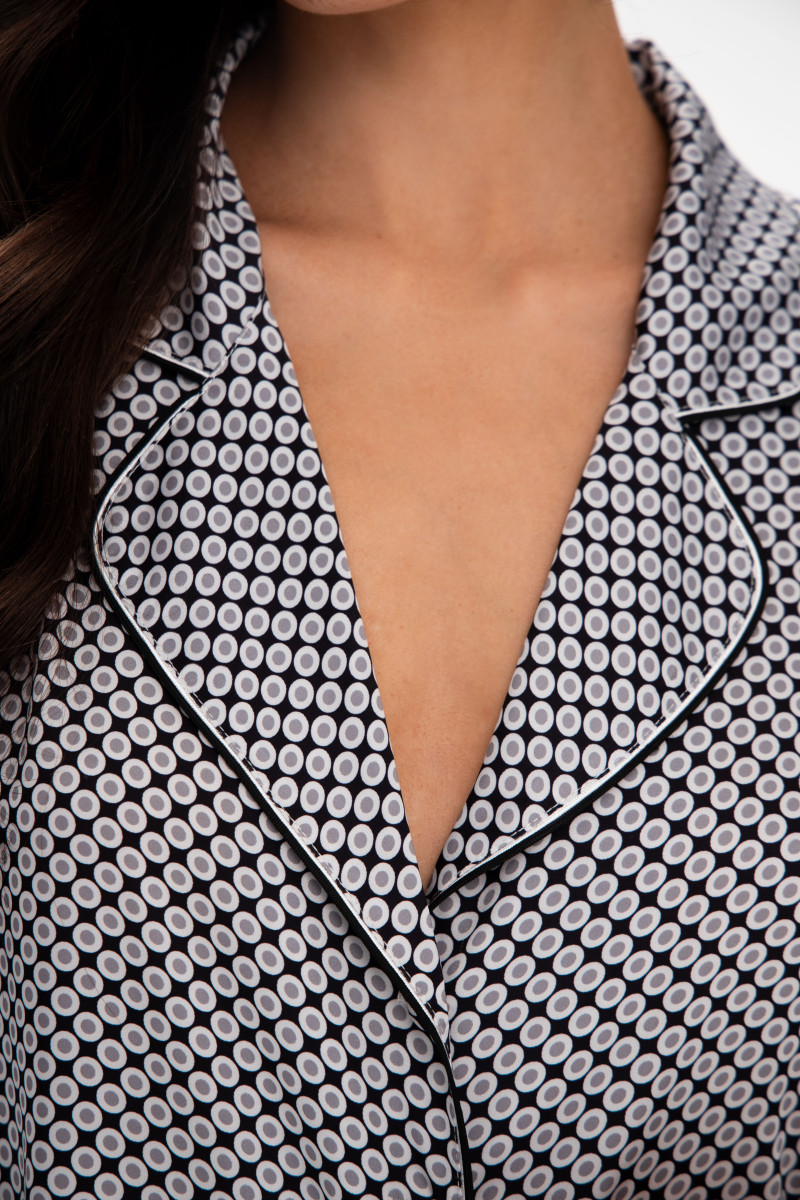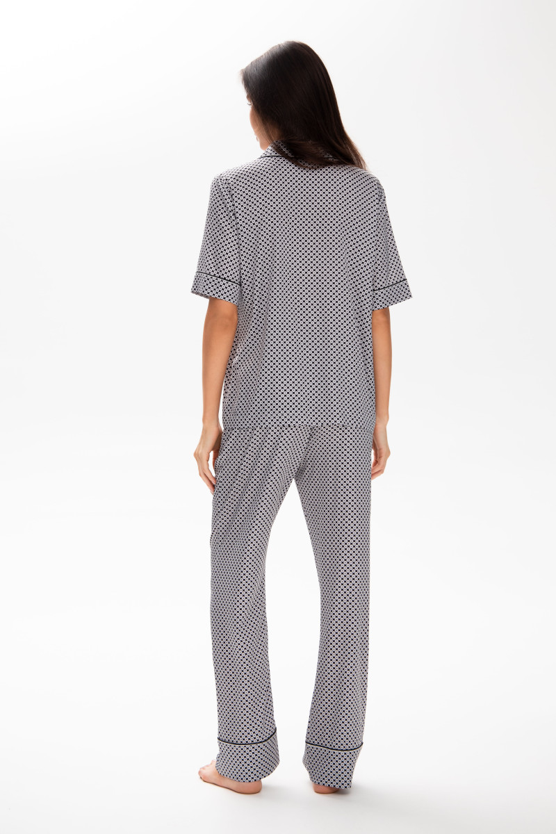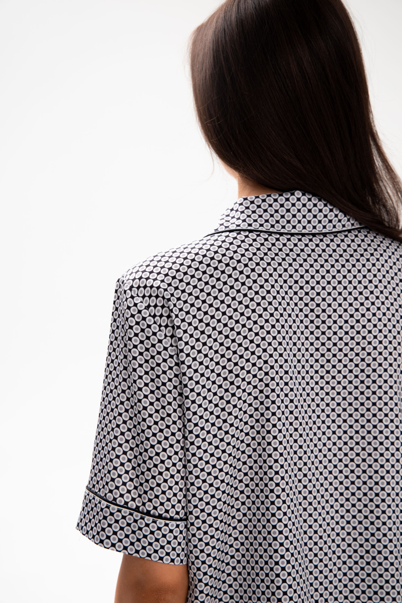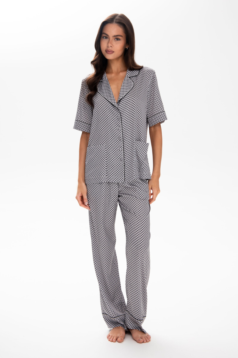 Пижамный коcтюм шелковый с кантом, кофта с коротким рукавом и штаны, принт серый