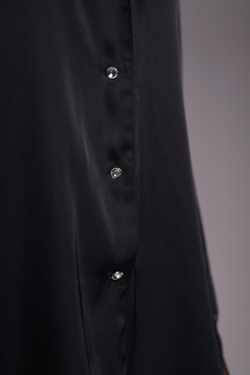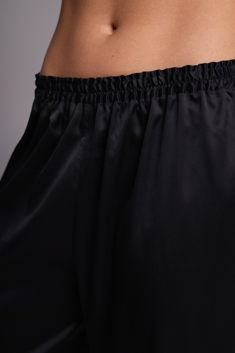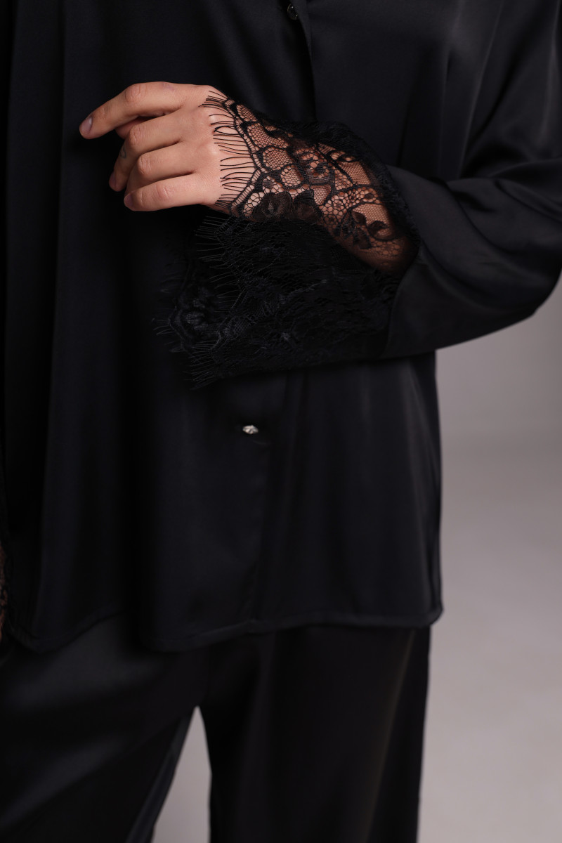 Этот черный классический пижамный костюм из атласной ткани создан для тех, кто ценит утонченную роскошь и комфорт. Благородный блеск атласа придает образу изысканность, а изящные детали превращают пижаму в полноценный наряд для особых моментов.