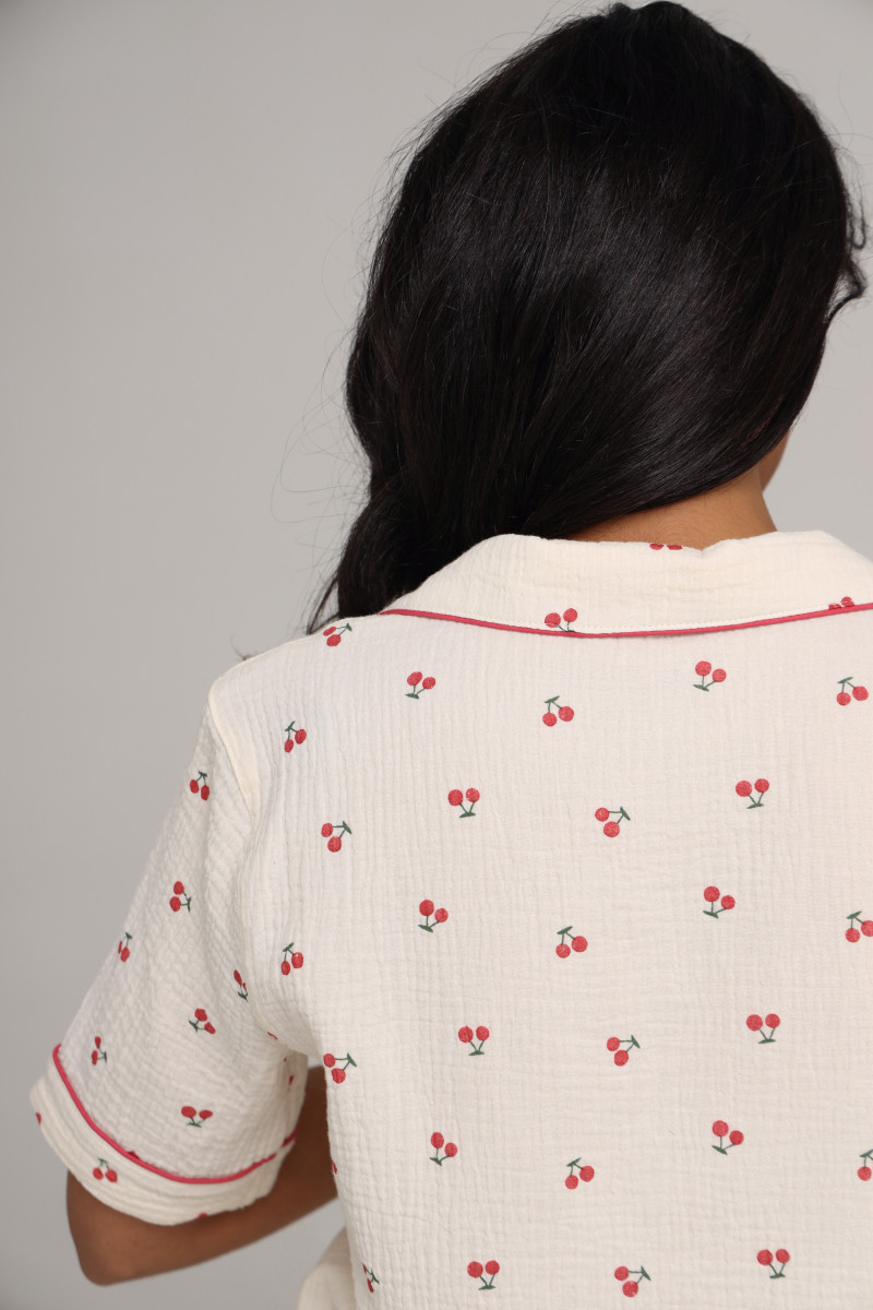 Сорочка виконана в класичному молочному кольорі і прикрашена делікатним принтом у вигляді маленьких вишень, який надає виробу грайливий, але витончений вигляд. М'який комір і накладні кишені надають додаткового комфорту, а ґудзики роблять виріб зручним та стильним.
