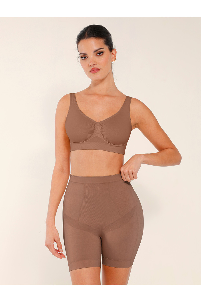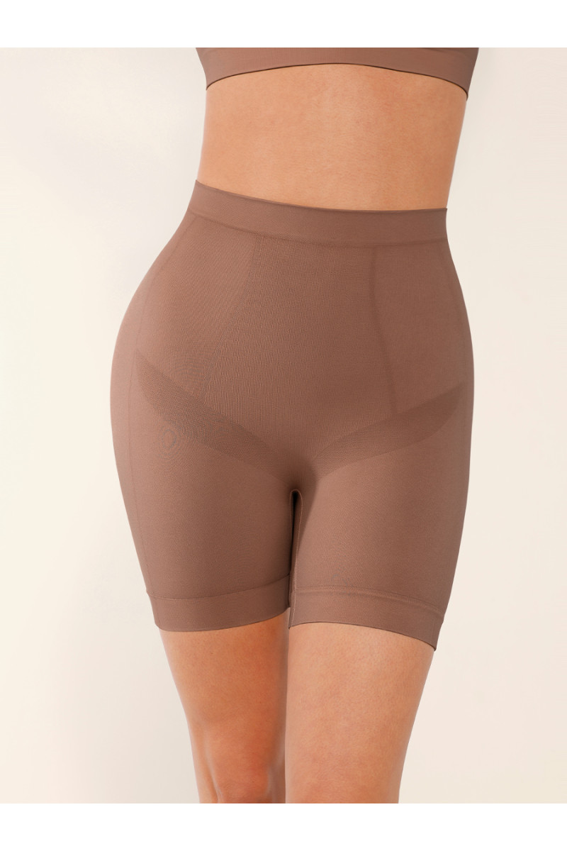 Высокая посадка обеспечивает надежную утяжку живота и талии, сглаживает проблемные зоны и формирует аккуратный контур без складок под одеждой. Плотная эластичная ткань равномерно распределяет давление, корректирует силуэт в области боков и бедер, при этом не сдавливает и не ограничивает движения. Бесшовная технология делает шорты практически незаметными под платьем, юбкой или облегающими брюками.