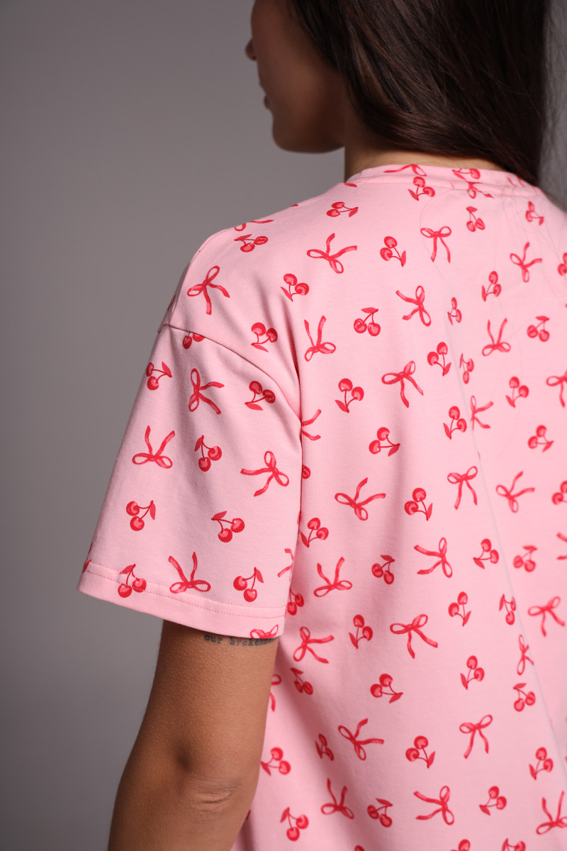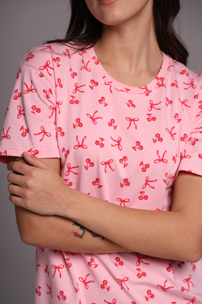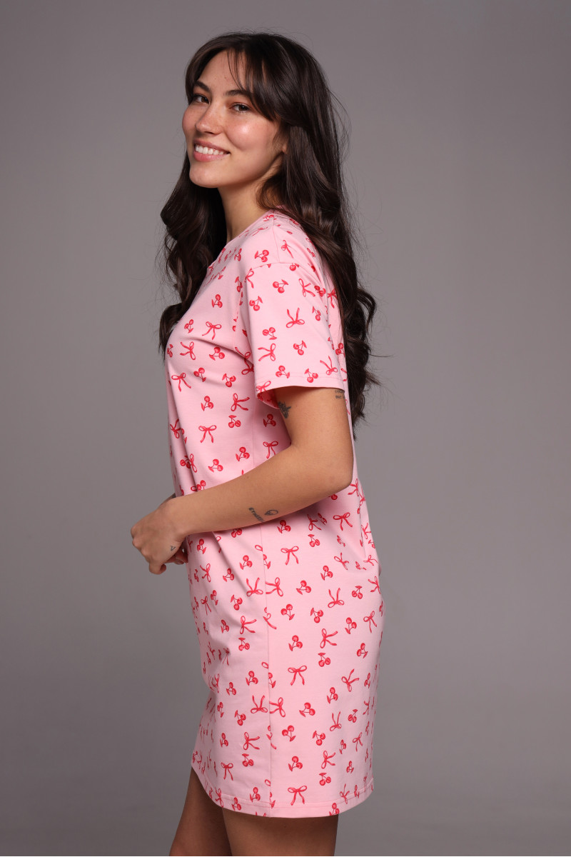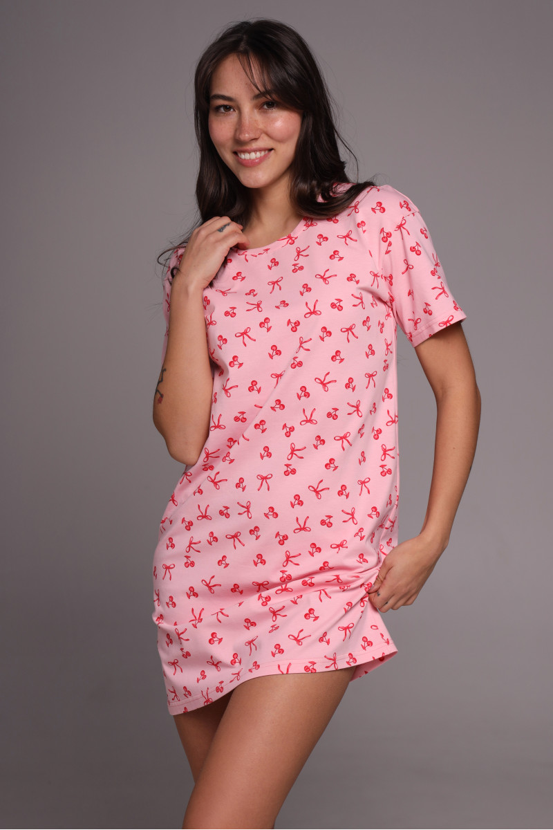 Прямой силуэт универсален и подходит для разных типов фигуры. Классический круглый вырез горловины и короткий рукав создают удобную посадку и обеспечивают свободу движений во время сна. Оптимальная длина модели делает сорочку практичным выбором как для ночного отдыха, так и для домашнего гардероба.