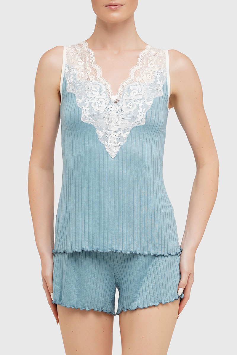 Майка украшена изящной кружевной вставкой в зоне декольте, которая добавляет образу утончённости и романтичности. Шорты имеют удобную посадку и не сковывают движений, что делает комплект максимально практичным и комфортным для ежедневного использования.